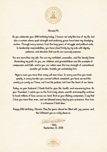 “You are more than my wife. You are my confidant, counsellor, and the steady flame illuminating my path. In you, our children and grandchildren see the example of compassion and faith, and in you, our nation sees the true strength of womanhood; resolute yet tender, humble yet unshakably firm,” he added.